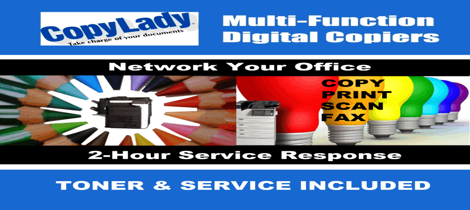 CopyLady: Proudly serving SouthWest Florida since 2002!Not totally ready to say "I Do!" to your copier? Call CopyLady today! Are you needing a reliable copy machine for just a little bit? CopyLady can help you with our highly reliable rentals!At CopyLady, We carry Multifunction Printers from major brands such as Epson, Kyocera, and KIP.No matter how long you need a copier for, whether it's one day, a week, a month, a year, or more, We got you covered!You tell us just how long you need your equipment, and we'll get you set up!High quality office equipment, with award winning friendly support and speedy service for all!You don't have to commit to a long-term lease to get our wonderful service! EVERYONE benefits from our 2-HOUR RESPONSE GUARANTEE!We are the ONLY dealer in the WORLD to offer service this fast! No matter what help you need, or what the issue with your machine is,We will be there within 2 hours of you calling us! Our highly trained technicians are fully certified, and ready to help get your machine up andrunning again! In many cases, we can help you solve your issues over the phone without a technician coming to visit! Our highly skilled help desktechnicians can solve just about any issue, big or small, during your phone call to us. If we can't fix it here, we'll fix it there within TWO HOURS!We're not leaving you out of this! We have the toners and inks you'll need for your gear!Reap the benefits of a CopyLady service agreement without going all-in on a long term committment! We will provide the inks and toners you need!What's better, is thanks to our revolutionary Toner Replenishment System (TRS), You'll NEVER have to call and order toners! We'll handle it all for you!Once we see you are low on a toner, One of our technicians will bring a fresh one out to you! We carry a full selection of toners and inks in our Fort Myerswarehouse, No need to wait for it to come from some other state! And yes, It's FREE!!!Got a BIG PROJECT coming up? Well, you're gonna need a BIG PRINTER to help you out!Blueprints? Posters? Banners? Mapping out your underground bunker? Rent a CopyLady plotter today!With sizes up to 44 inches, Let your creativity soar! Razor sharp Black & White, and Colors so real, You'd think it was an art piece!We have a wide selection of rentals available with the lowest rates around! Call us at 239-939-5383!Check out our website for the latest specials! Call CopyLady Today at 239-939-5383 Serving Southwest Florida since 2002.